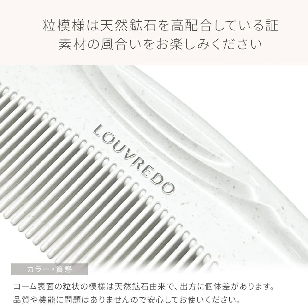 コーム本体に浮き出ている筋状の模様は粉末状にして練り混んだ鉱石です。使用上問題ございませんので安心してご使用ください。