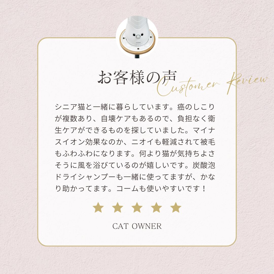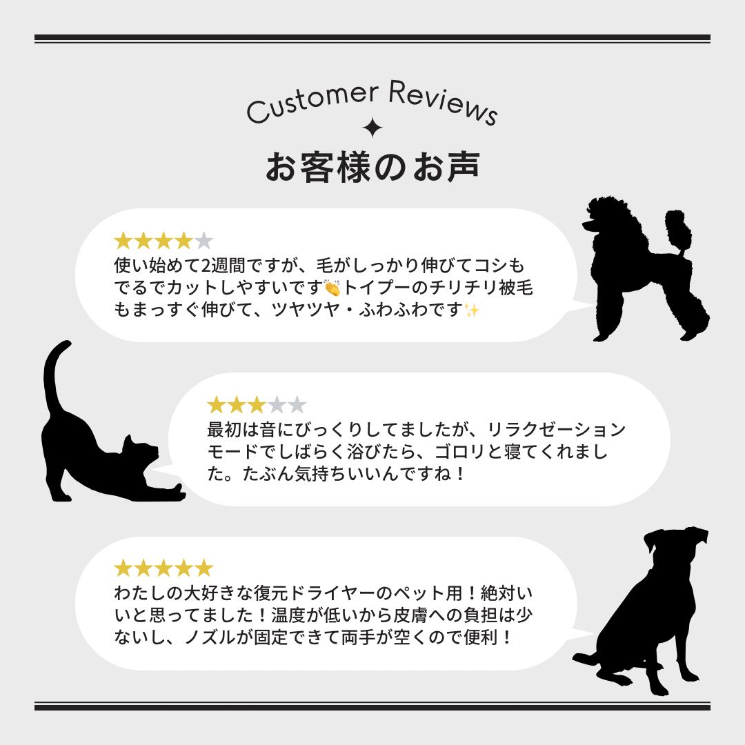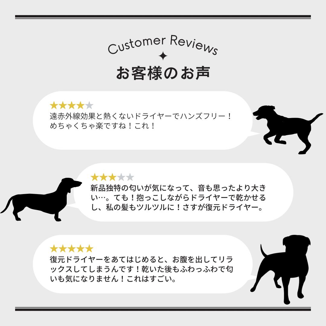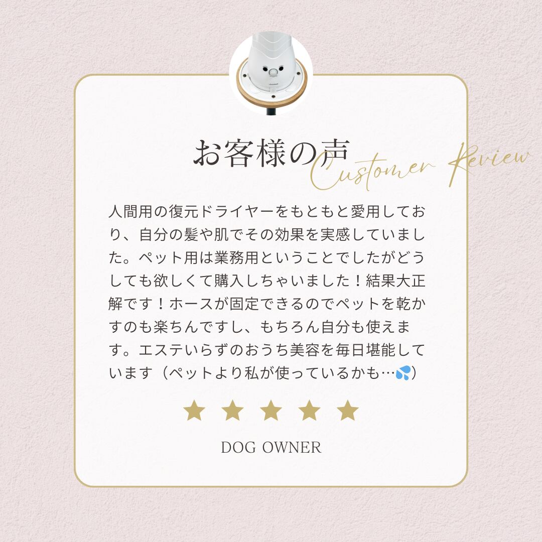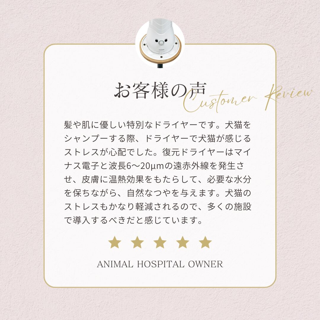復元のやわらかな風がペットを包み込み、ストレスを軽減します。お風呂上りに乾かすのはもちろんですが、お散歩帰りの衛生ケア、臭いや被毛のべたつきがちょっと気になる時にも大活躍。ドライヤーが苦手なこにも、是非試して頂きたい自信作です。