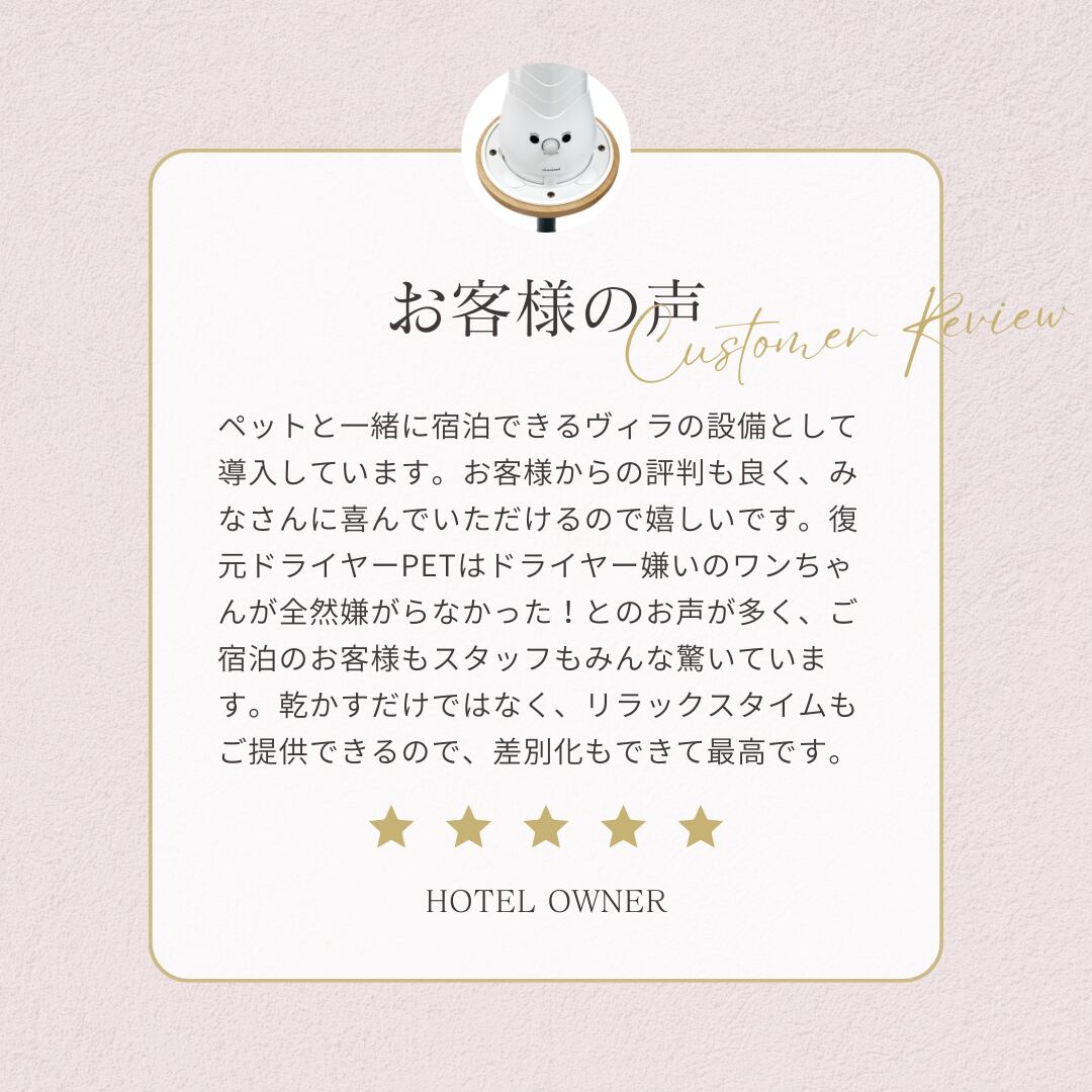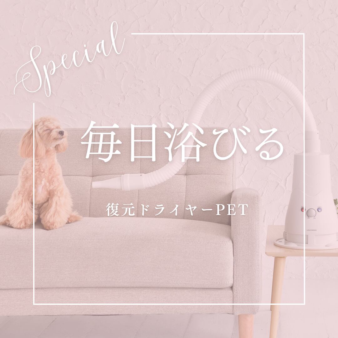 復元ドライヤーPETは、あなたとあなたの大切なペットのために設計された高機能ドライヤーです。復元の風を浴びることで、ペットの皮膚と被毛をいたわります。ドライヤーなのにしっかりと潤い、サラサラ・ふわふわの仕上がりに。まさに新時代ケアスタイルのご提案です。