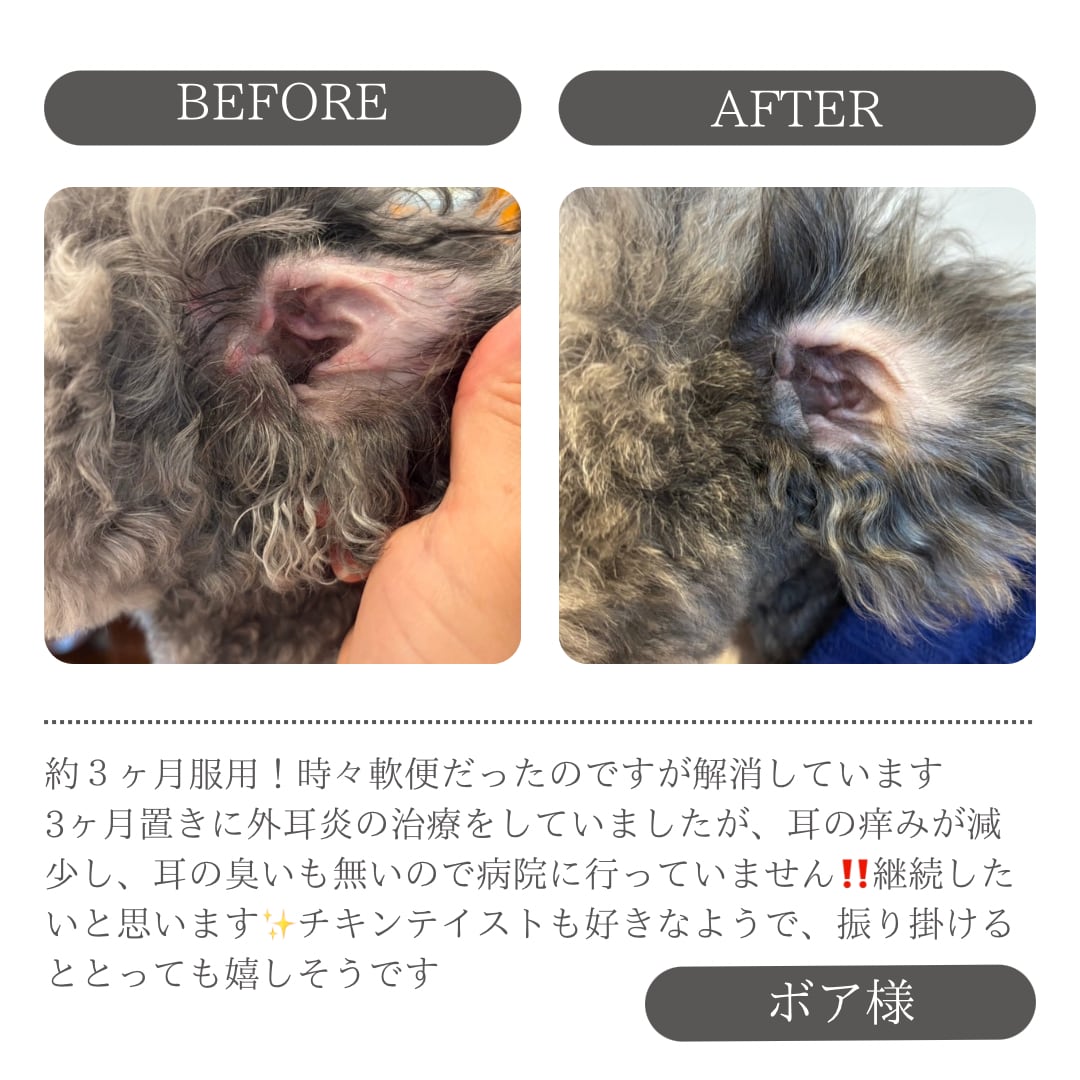 今3ヶ月服用してます。まず涙やけ減少、さらに毛並みが若返り根本からフワフワになりました。毎日、目がツヤツヤしてます👀もう8歳ですが、シニアとは思えないほど毎日元気にボール投げをして走り回ってます!